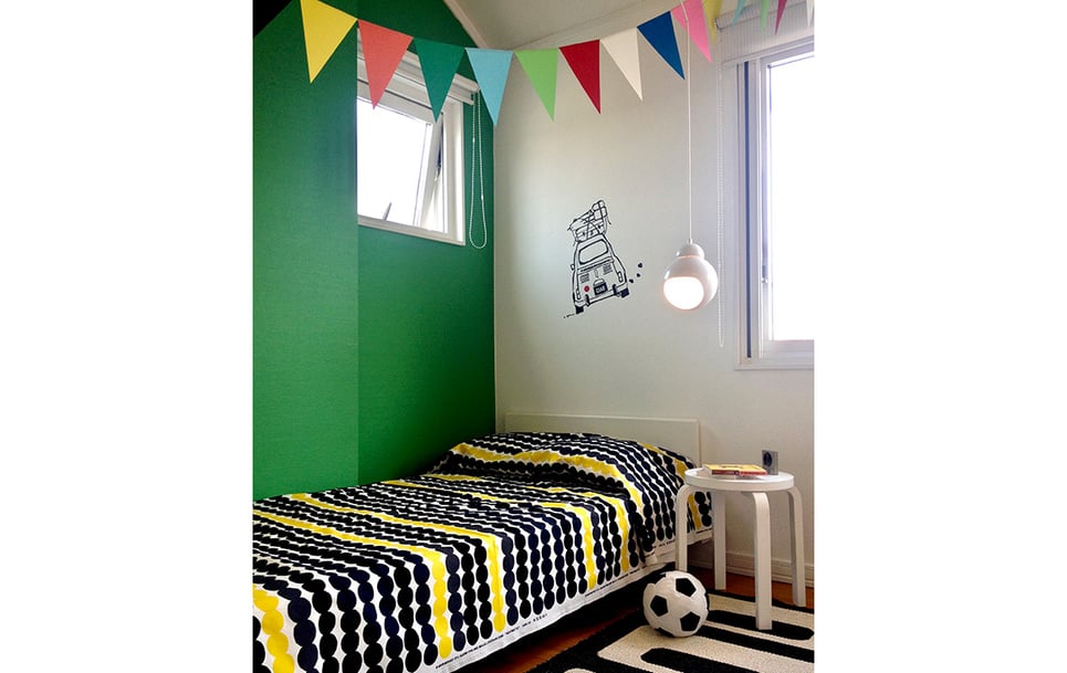 マスキングテープを活用してプチリノベしたグリーンウォールの子供部屋。ウォールステッカーやモビールを使うと、より遊び心あふれる雰囲気に